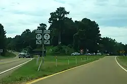 MS 9W begins at an intersection with MS 9 to the north of Bruce in Calhoun County.[2] The route heads northwest on a two-lane undivided road through a mix of woods and farmlands with a few homes. The road turns to the north and reaches the community of Banner, where the road crosses two County Roads: CR 275 and CR 267. MS 9W enters a dense forest as it curves northwest again and heads into more agricultural fields, coming to a junction with CR 284.[1] After crossing into Lafayette County, the route reaches the community of Paris and intersects the eastern terminus of MS 315 as well as CR 428.[2] After this intersection, MS 9W passes through several more miles of forests, intersecting CR 371 before reaching its terminus at MS 7 to the south of Oxford.[2][1] MS 9W is legally defined in Mississippi Code § 65-3-3.[3]