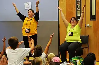 Missoula Children's Theatre's touring program is unique in its approach to casting local children.[14] Communities have to ask for MCT to come and do a residency.[4] There are approximately 40–50 traveling teams that each consist of two adult actor-directors. MCT staff usually travel to communities in distinctive red pickup trucks that carry the scripts, costumes, props, and other items required to put on a play.[3] While there is a small or no charge to the local children who participate,[15] communities support the program by providing lodging for the MCT staff, performance and rehearsal space, a piano and accompanist, publicity, and a residency fee (which varies by region). Generally, 50 to 60 children are cast, and they have 20 hours of rehearsal.[16] MCT presentations are original musical adaptations of classic children's stories, usually with a humorous twist. Local children audition for roles, and then rehearse for six days prior to putting on two performances. The MCT team also conducts enrichment workshops that serve additional children.[3][4]