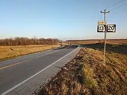 Route 20 was one of the original 1922 highways. Its eastern terminus was originally at Huntsville at Route 10 (now U.S. Route 24). Its western terminus was originally in Kansas City at Route 1. In 1926, the section west of Waverly became part of U.S. Route 24 and the section from Waverly to Marshall became part of U.S. Route 65.[5] In 1933/1934, Route 20 was extended west on its current alignment to Higginsville. This section had been planned as Route 96 (Odessa to Marshall) in 1922, but was soon dropped from the state highway system. In 1934/1935, the section from Glasgow to Huntsville became part of Route 3 when that route was extended. The next year, the section from Marshall to Glasgow became part of Route 240. Route 20 connects the towns of Higginsville, Corder, Alma, Blackburn and Marshall.[6]