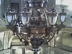 In November 2006, the 9,000 lb (4,100 kg) dome chandelier, which had been lowered almost to the floor for maintenance, fell the remaining five feet.[7] The chandelier was damaged by the impact and by the ornamental chains that fell on it. It was sent to a St. Louis company for repairs. Nearly a full year later, the chandelier was returned to Jefferson City and raised in the capitol. The upper lights were also restored, after they had been turned off for four decades due to light damage to the mural above. Created in 1918 by the Guth Lighting Company of St. Louis for a cost of $5,000 (equivalent to $104,524 in 2024), the chandelier cost $500,000 (equivalent to $779,878 in 2024) to be restored.[8]
