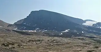 Mistaya Mountain is located on the border of Alberta and British Columbia, on the Continental Divide. It was named in 1918.[1][3] Mistaya is either the Cree name for "grizzly bear"[6] or is the Stoney word for "much wind".[7]