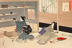 Preparing the washing area in a tea ceremony room, woodblock by Toshikata Mizuno, 1896