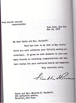 Risikoff's first name, "Mnachem," appears in variant forms including "Menachem" and "Menahem," but "Mnachem" is the spelling he seems to have preferred during his time in the United States, and was the spelling used in writings that spanned many years—from the 1938 letter from President Franklin Delano Roosevelt, congratulating Risikoff on his 50th wedding anniversary;[39] a news story in the Brooklyn Eagle about Risikoff that referred to him as "one of the oldest Orthodox rabbis in Brooklyn; a photo and caption on file with the Brooklyn Public Library;[40] and the 2010 press release from the Library of Congress that described the donation of two of Risikoff's unpublished manuscripts.[41] (In another Brooklyn Eagle article, Mnachem is used as the spelling of his first name, although his last name is spelled differently.) Most importantly, however, "Mnachem Risikoff" was the spelling Risikoff used on his own printed stationery.[42]