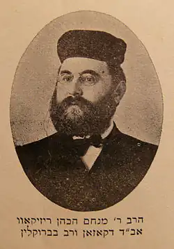 In 1895, after serving as a rabbi in a small town in Lithuania, he was appointed rabbi of Kazan.[3] He emigrated to the United States in 1906, following anti-Jewish riots in that area,[3] serving as rabbi in a number of synagogues in Brooklyn, including Ohev Shalom, in Brownsville;[5] Keter Israel; Beth Ha-Knesseth Adath B'Nai Israel,[6] also referred to as Williamsburg's Moore Street Congregation;[7] and finally, Dibre Mnachem, a congregation named after the first book Risikoff published after moving to the United States, located in the area now known as Bedford-Stuyvesant, on one floor of the building where he lived for many years, until his death in 1960.[8]