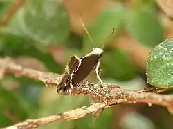 This species is small with pale brown forewings iridescent with brass colour tones.[1] There are two white thin lines on the forewings.[1]