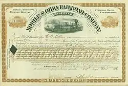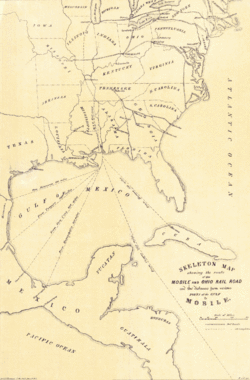 The Mobile and Ohio Railroad was a railroad in the Southern U.S. The M&O was chartered in January and February 1848 by the states of Alabama, Kentucky, Mississippi, and Tennessee. It was planned to span the distance between the seaport of Mobile, Alabama and the Ohio River near Cairo, Illinois.[1] On September 13, 1940, it was merged with the Gulf, Mobile and Northern Railroad to form the Gulf, Mobile and Ohio Railroad.[2]