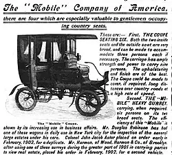 Mobile's version of the steam carriage had a 5 to 12 horsepower engine, with a water tank range of about 35 miles and a gasoline tank range of between 60 and 75 miles. In 1901 kerosene could replace gasoline for fuel. Originally built as a light runabout, Mobile added up to 24 styles of bodies to improve poor sales. By 1902, a top speed of 50 mph was claimed. Prices for the Model 4 runabout started at $750 (equivalent to $27,257 in 2024) rising to a 9-passenger "coupe" Model 50 at $3,000 (equivalent to $109,027 in 2024).[2][1]