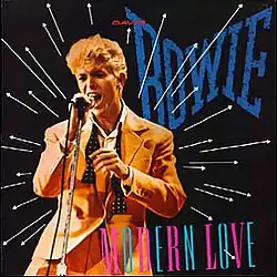 "Modern Love" was released on 14 April 1983 as the opening track of Let's Dance.[11] It was later released on 12 September 1983 by EMI America on seven-inch vinyl (as EA 158, featuring the shortened single version), and on twelve-inch vinyl (as 12EA 158, featuring the full length song) as the third single of the album,[12] with a live version, recorded in Montreal in July 1983,[7] as its B-side.[13] The single reached number two on the UK Singles Chart and number 14 on the US Billboard Hot 100.[14] By the time "Modern Love" was issued as a single, Bowie's Serious Moonlight Tour was underway.[15]
