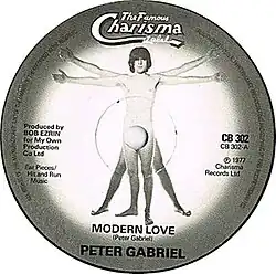 In June 1977, "Modern Love" was lifted as the second single from Gabriel's debut solo album with "Slowburn" as the B-side.[6] Radio & Records listed the song at number 19 on its English Airplay chart in the 8 July 1977 edition of the publication.[7] The single did not appear on any all-genre chart that encompassed both sales and airplay.[6] Gabriel had originally wanted to release "Modern Love" as the lead single instead of "Solsbury Hill". When asked by Melody Maker why the single failed to match the commercial performance of "Solsbury Hill", the previous single, Gabriel posited that most people who would have otherwise purchased "Modern Love" already had the song on his first solo album. He said that the BBC was unwilling to promote the single despite a willingness for some radio stations to play it.[8] The artwork on the disc featured Gabriel nude in a Vitruvian Man pose with the spindle hole obscuring his crotch.[9]