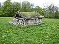 From the beach the trail leads back west through the forest past reconstructed houses including The Tustrup House. The original house was located in the town of Tustrup on the peninsula of Djursland north of Aarhus. This house was probably used for religious ceremonies and perhaps for storing dead bodies until all that remained was bones, which could then be placed in a passage grave or stone barrow.[14] The Prehistoric Trail ends back at the Manor, which nowadays houses the museum administration, Aarhus University offices and student facilities. There is no public access to these buildings. However just across the road is the last point of interest on The Prehistoric Trail, the reconstructed stave church from a town about 35 km to the north of Moesgaard.[15]