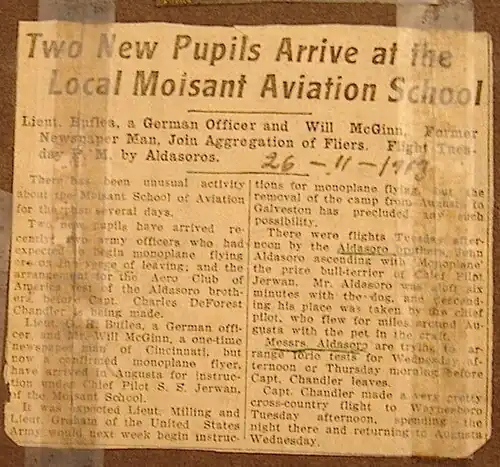Many early aviators learned to fly or perfected their skills at this school, among them Harriet Quimby first American pilot, Matilde E. Moisant, John's and Alfred's sister and the second woman to obtain a pilot's license in the United States, the Aldasoro brothers Juan Pablo and Eduardo, two Mexican pilots who had started to fly gliders in 1909, Dante Nannini Sandoval, first Guatemalan Pilot, and Bernetta Adams Miller, the fifth licensed woman pilot in the U.S. Under the auspices of the school, Bernetta Miller demonstrated the Moisant/Bleriot monoplane to the U.S. Army in October, 1912, and subsequently made an unsuccessful attempt on the women's altitude record.