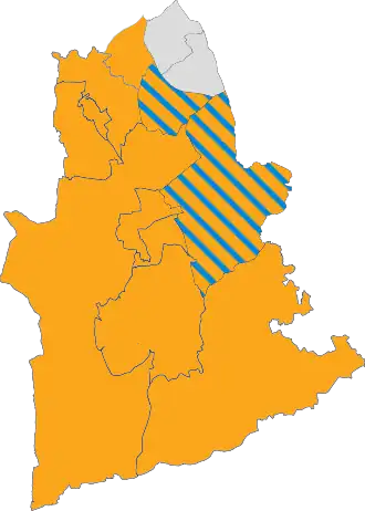 Map of Mole Valley district, showing the political composition of the council after the 2024 Election. Liberal Democrats in yellow, Ashtead Independents in grey and Conservatives in blue.[1]