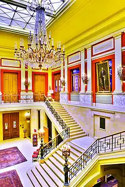 The entrance features four Tuscan marble columns. An impressive chandelier in bronze and crystal hangs in this room. The names of the mayors are engraved in the marble stones from the upper part of the walls. In the centre above the staircase of honour is a portrait of Henri Hollevoet, the mayor who inaugurated the Municipal Hall in 1889.[10] The aldermen's offices, located on the first and second floors, have undergone various adaptations due in particular to the increase in aldermen over time.[11] The mayor's office is majestic, located under the dome whose ceiling is lined with a allegorical painting by Amédée Lynen symbolising Education, Public assistance, Civil protection, Justice, Art and Letters and Marriage.[12][1]