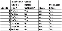 PCR testing has advanced the state of the art in research, but PCR can be negative in individuals with Mollaret's, even during episodes with severe symptoms. For example, Kojima et al. published a case study for an individual who was hospitalized repeatedly, and who had clinical symptoms including genital herpes lesions. However, the patient was sometimes negative for HSV-2 by PCR, even though his meningitis symptoms were severe. Treatment with acyclovir was successful, indicating that a herpes virus was the cause of his symptoms.[16]