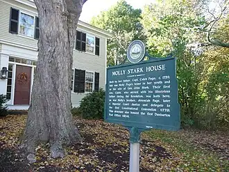 The Molly Stark House still stands in Dunbarton at Page's Corner, denoted by a New Hampshire historical marker (number 111);[16] it was added to the New Hampshire State Register of Historic Places in 2003.[3] The Molly Stark cannon, or "Old Molly", bears her name, and is kept by the New Boston Artillery Company, denoted by a New Hampshire historical marker (number 146).[16] The Molly Stark Chapter of the Daughters of the American Revolution is located in Manchester.[17]