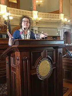 In 2016, Murnan filed to run as a Democrat for the Kansas House of Representatives' 3rd district seat against the Republican incumbent, Representative Chuck Smith,[8] citing that she "felt the state was in a dire circumstance, near bankruptcy and did not resemble the state she remember[ed] growing up in." The district was a high-priority target for Kansas Democrats, as Smith had won the swing district from its previous Democratic occupant Julie Menghini by just 114 votes in 2014.[9] Campaigning against unpopular Governor Sam Brownback[10] and Smith's votes in support of his agenda, Murnan emerged victorious by a four-point margin. She was re-elected by a 10-point margin in 2018.[11] Murnan was narrowly defeated in a 2020 rematch with Smith.