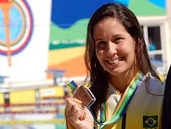 At the 2003 Pan American Games, in Santo Domingo, won the silver medal in the 4×200-metre freestyle, breaking the South American record, with a time of 8:10.54, along with Ana Muniz, Mariana Brochado, Paula Baracho[16] She also won two bronze medals in the 400-metre freestyle, and in the 4×100-metre freestyle.[17]
