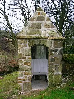 A C-listed summerhouse is recorded at NS 323 454[15] The OS maps show that the first entrance off the Auchentiber Road, with its lodge, 'Golconda' was abandoned, probably due to limestone workings and the present day entrance with its Edwardian Monkredding Lodge was built to replace it. Before the turnpike road was built the entrance was off the ancient Kilwinning to Beith Road near Laigh Gooseloan that ran onwards via Jameston and Drumbuie.[16] The 1832 Thomson map shows an access running directly up to the house along the route of the present road.[17] Golconda is a ruined city in south-central India, west of Hyderabad and capital of an ancient kingdom (c. 1364-1512). The connection is not known.
