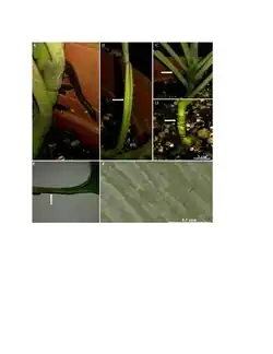 | Adult plant without perforations (A), a juvenile with a sheath and wings (C), a cross section of the petiole showing sheath wings (B), and a mature inflorescence with cataphylls at the base (E)[1] | |