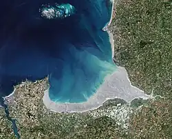 The Mont-Saint-Michel Bay (French: baie du Mont-Saint-Michel, pronounced [bɛ dy mɔ̃ sɛ̃ miʃɛl]; Breton: Bae Menez-Mikael) is located between Brittany (to the south west) and the Normandy peninsula of Cotentin (to the south and east).[2] The bay was listed as a UNESCO world heritage site in 1979 for its aesthetic quality and its importance to the Christian tradition.[3] Due to the significant tidal movements in this region (over 10 meters) a large part of the bay is uncovered at low tide. There are two granitic islands in the bay: Tombelaine and the Mont-Saint-Michel. Many birds and harbor seals live in this area.