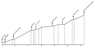 The line runs from a connection with the SNCF at Saint-Gervais-les-Bains Le Fayet station to the Nid d'Aigle station near the Bionnassay Glacier at an altitude of 2,372 m (7,782 ft). The initial intention was for the line to reach the much higher Aiguille du Goûter. Nevertheless, it remains one of the highest railways in Europe and the second-highest when considering only open-air railways.[5] The Nid d'Aigle and Mont Lachat (2,074 m (6,804 ft)), the two highest stations of the line, are the only railway stations over 2,000 metres in France. Both are well over the tree line.