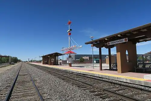 Montaño is a station on the New Mexico Rail Runner Express commuter rail line on Montaño Rd. between Edith Blvd. and Second St., in Albuquerque, New Mexico. The station opened on April 7, 2014, marking the end of construction of the Montaño Transit Center. [1] [2]
