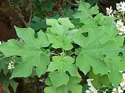It is an erect, tree-like, perennial shrub that is 2 to 7 m (7 to 23 ft) tall.[2][3] Leaf arrangement is simple and their form is opposite. They are pinnatifid when young, and palmately lobed during maturity. The leaves are up to 25 cm (10 in) in length and width, dark green above and paler below, and smoothly hairy on both surfaces, with a pair of lobes at the base of the leaf blade.[4]