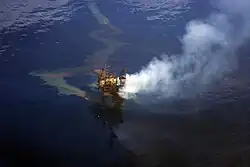 The Montara oil spill was an oil and gas leak and subsequent slick that took place in the Montara oil field in the Timor Sea, off the northern coast of Western Australia. It is considered one of Australia's worst oil disasters.[1] The slick was released following a blowout from the Montara wellhead platform on 21 August 2009, and continued leaking until 3 November 2009 (in total 75 days), when the leak was stopped by pumping mud into the well and the wellbore cemented thus "capping" the blowout.[2][3] The West Atlas rig is owned by the Norwegian-Bermudan Seadrill, and operated by PTTEP Australasia (PTTEPAA), a subsidiary of PTT Exploration and Production (PTTEP) which is in turn a subsidiary of PTT, the Thai state-owned oil and gas company was operating over on adjacent well on the Montara platform. Houston-based Halliburton was involved in cementing the well.[4] The Montara field is located off the Kimberley coast, 250 km (160 mi) north of Truscott airbase, and 690 km (430 mi) west of Darwin.[5][6][7] Sixty-nine workers were safely evacuated from the West Atlas jackup drilling rig when the blowout occurred.[6][8]