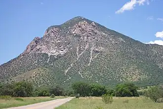 Montezuma Peak is located 12 miles (19 km) south of the city of Sierra Vista in Coronado National Memorial. It is the highest point within the memorial which is administered by the National Park Service,[5] and the 10th-highest summit in the Huachuca Mountains.[3] The mountain is composed of dacite tuff and granite.[6] The slopes are covered by oak woodlands, silk tassel, sumac, pointleaf manzanita, agave, yucca, and sotol.[7] Precipitation runoff from this peak's slopes drains east to the San Pedro River drainage basin.[3] Topographic relief is significant as the summit rises 2,280 feet (695 meters) above Montezuma Canyon in 0.8 mile (1.3 km). Coronado Cave is set within the south slope of the peak. The nearest higher neighbor is Miller Peak, 2.5 miles (4.0 km) to the northwest.[3] The mountain's toponym was officially adopted in 1959 by the U.S. Board on Geographic Names.[2][8]