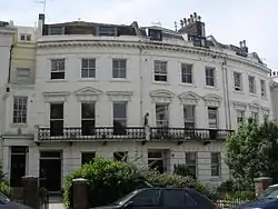 These three houses rise to three storeys and form a slightly outward-curving nine-bay composition whose outermost bays (containing the entrances for numbers 1 and 3) are recessed.[26] The curved effect is much less pronounced than in the centre of the crescent.[2] At first-floor level, a cast iron balcony supported on brackets spans the other seven bays.[26] The houses are topped by a parapet which is supported on a modillion cornice and which continues round the side elevation of number 1, which faces Clifton Hill.[26] Each house has a three-window range; those at first-floor level have architraves of various styles (flat cornices, curved pediments and triangular pediments), while at the top floor original sash windows survive. The doors, which are four-panelled and have decorative fanlights, are set in porches flanked by pilasters and topped by an entablature. The ground-floor walls are heavily rusticated. The roof has chimneys at the sides and is hidden behind the continuous parapet.[26]