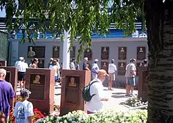 The Yankees moved the center field fence in to 410 feet (120 m), so that the Yankees could make Monument Park accessible to fans prior to most games at Yankee Stadium.[14] Monument Park was also part of the public tour of the venue.[15] The Yankees retired No. 10 for Phil Rizzuto in August 1985 and No. 1 for Billy Martin in August 1986, while dedicating plaques for both.[16][17] The Yankees dedicated plaques to Ford and Lefty Gomez on August 1, 1987.[18] The Mantle and DiMaggio plaques were removed from the wall upon their deaths in 1995 and 1999, respectively, and mounted on red granite blocks matching the original three of Huggins, Gehrig, and Ruth.[19][20]