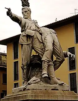The Monument of Piazza Mentana or Monument to those fallen at the Battle of Mentana (Monumento ai caduti della battaglia di Mentana) is an early-20th century outdoor stone statue located the said square of Florence, Italy. The monument displays two patriotic fighters of Garibaldi's units, one wounded, the other fighting, in a dramatic scene.