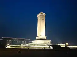 The Monument to the People's Heroes (Chinese: 人民英雄纪念碑; pinyin: Rénmín Yīngxióng Jìniànbēi) is a ten-story obelisk that was erected as a national monument of China to the martyrs of revolutionary struggle during the 19th and 20th centuries. It is located in the southern part of Tiananmen Square in Beijing, in front of the Mausoleum of Mao Zedong. The obelisk monument was built in accordance with a resolution of the first plenary session of the Chinese People's Political Consultative Conference (CPPCC) adopted on November 30, 1949, with construction lasting from August 1952 to May 1958. The architect of the monument was Liang Sicheng, with some elements designed by his wife, Lin Huiyin. The civil engineer, Chen Zhide (陈志德) was also instrumental in realizing the final product.[1]
