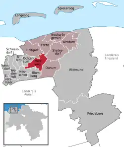 WangeroogeWittmund (district)Lower SaxonySpiekeroogLangeoogBaltrumWilhelmshavenFriesland (district)Leer (district)Aurich (district)FriedeburgWittmundHoltgastEsensNeuharlingersielWerdumStedesdorfNenndorfEversmeerNeuschooBlombergDunumMoorwegUtarpOchtersumSchweindorfWesterholt