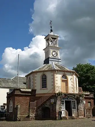 The present building was commissioned by the lord of the manor, Frederick Howard, 5th Earl of Carlisle, whose seat was at Naworth Castle. It was designed in the Vernacular style, built in rubble masonry with a stucco finish and was completed in 1817.[5] The design involved an octagonal structure facing west onto the Market Place. The first floor was faced with a stucco finish and there were quoins at the corners. There was a segmental-shaped opening with voussoirs on the ground floor flanked, on both sides, by a stone staircase with wrought iron railings which gave access to the first floor. On the first floor there was an arched doorway with an architrave at the front, and arched windows with architraves on the other sides. At roof level there was a clock tower with a belfry surmounted by an ogee-shaped roof, a ball finial and a weather vane. Internally, the principal rooms were the market hall on the ground floor and an assembly hall on the first floor.[1] The ground floor was originally open and was used to sell poultry and dairy products.[6] A ring to tether bulls for the purpose of bull-baiting was installed in the cobbles in front of the building, although this practice was outlawed by the Cruelty to Animals Act 1835.[7]