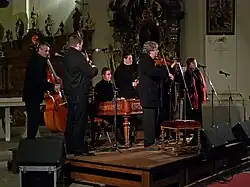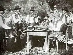 Moravian folk music performances use various traditional and characteristic instruments. "Cimbalom bands" are among the most visible and iconic ensembles that perform traditional music today.[6] The "small" cimbalom characteristic of Moravian music in the 19th century, however, has been replaced by the "standard" (or Hungarian) cimbalom, a rather new instrument only gaining wide use in the 20th century.[7] The leader and "conductor" of the cimbalom band is often a violinist, called "primáš" in Czech, who plays the leading melody with ornamentation. A second violinist, "obligát", often plays the plain melody and supports the "primáš". The harmonic variety of the string instruments is often supported also by other violinists or violists. They are called "terc" as they usually play a third lower than the leading melody or "kontry", playing accompaniments.[8] Other important instruments of the Moravian cimbalom band are clarinet, ornamenting the melody, and double bass.