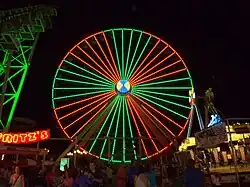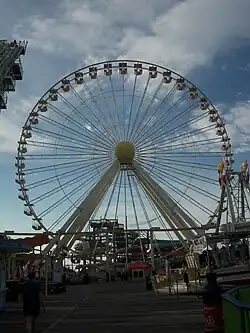 Mariner's Pier, located at Schellenger Avenue in Wildwood, is like a traditional amusement park, with classics like the Super Scooters, Teacups, Musik Express, Ignis Fatuus, Sea Serpent and the Giant Wheel, a 156-foot (47.5 m) tall Ferris wheel built by Vekoma, which opened in 1985.[1] In the early mornings of the summer, breakfast can be eaten on the wheel.[2][3] In June 2011, 11-year-old Abiah Jones died after falling from the Giant Wheel. Since then, a "no single riders" policy was created for when guests ride the ferris wheel to ensure the safety of the guests.