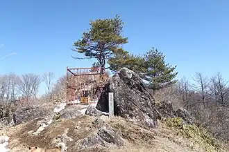 Behind the Upper Shrine, straddling the border between the cities of Suwa and Ina, stands the 1,650 metre-high[52][53] Mount Moriya.[53][54] On its eastern peak stands a miniature shrine or hokora enshrining a deity referred to in old documents as 'Moriya Daijin' (守矢大臣 or 守矢大神). This god is identified with either the Moriya of Suwa legend[55] or the deified Mononobe no Moriya, who is worshiped in a shrine on the opposite (southern) side of the mountain, in the town of Takatō (part of Ina City). Indeed, the hokora is considered to be this shrine's oku (no) miya (奥宮, lit. "inner shrine" or "rear shrine"[i]).[57][58]