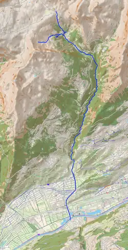 The Morge forms the boundary between the municipalities of Conthey and Savièse along its valley, and between Conthey and Sion in the Rhône plain. It also marks the border between the districts of Conthey and Sion.[3] Its adjacent drainage basins include the Lizerne to the west, the Sarine to the northwest, the Geltenbach to the north, the Lienne to the northeast, the Sionne to the east, and the Rhône to the south.[4][5]