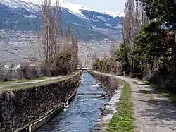 Before the Christian era, the Morge marked the boundary between the Seduni, whose territory extended along the left bank to Visp, and the Veragri, who inhabited the right bank up to the Mauvoisin torrent near Saint-Maurice. During the Middle Ages, it served as the border between the episcopal seigneury of Sion and the Savoyard castellany of Conthey. The bishop of Sion held customs rights in this area, and several treaties between the bishops of Sion and the counts of Savoy were concluded along the Morge.[2]