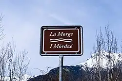 Sign for La Morge in Conthey with name in French and local “patois” (Valais dialect).