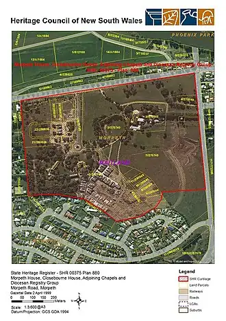 - ^ a b c d e f g h i j k l m n o p q r s t u v w x y z aa ab ac ad ae af ag ah ai aj ak al am an ao ap aq ar as at au av aw ax ay az ba bb bc bd be bf bg bh bi bj bk bl bm bn bo bp bq br bs bt bu bv bw bx by bz ca cb cc cd ce cf cg ch ci cj ck cl cm cn co cp cq cr cs ct cu cv cw cx cy cz da db dc dd de df dg dh di dj dk dl dm dn do dp dq dr ds dt du dv dw dx dy dz ea eb ec ed ee ef eg eh ei ej ek el em en eo ep eq er es et eu ev ew ex ey ez fa fb fc fd fe ff fg fh "Morpeth House, Closebourne House, Adjoining Chapels and Diocesan Registry Group". New South Wales State Heritage Register. Department of Planning & Environment. H00375. Retrieved 1 June 2018.