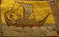 Noah and the Animals Enter the Ark | Double scene, showing a certain modernity in the animals. Ponticelli attributed it to a 1483–1499 intervention by Alesso Baldovinetti, inspired by Paolo Uccello's frescoes Scenes from the Life of Noah in the Chiostro Verde of Santa Maria Novella. Roberto Longhi instead argued the mosaic was earlier than the fresco, with the latter drawing on the former. Soulier noted Egyptian or Syriac influence. |