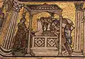 | Pharaoh's Dreams | It differs from the preceding scenes by a richer palette of colours, though this could be due to a different mosaicist, whilst its lively composition in almost pathetic tones may attribute them to the Master of the Maddalena (Pesenti, 1978–1979). The curtain over Pharaoh's bed is a late 19th-century restoration. | |