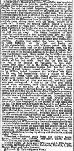 The Shield was a different matter, the Swifts apparently losing 2–1 at Tynecastle Park, but a protest that Vale's left-back Oag and inside-right Phillips for "professional irregularities" was upheld.[14] In the re-played final at Easter Road, the Swifts again won by 4–1.[15]