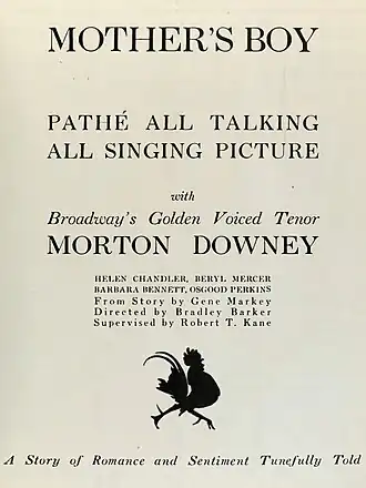 Mother's Boy is a 1929 American black-and-white musical drama film directed by Bradley Barker and starring Morton Downey and Beryl Mercer.