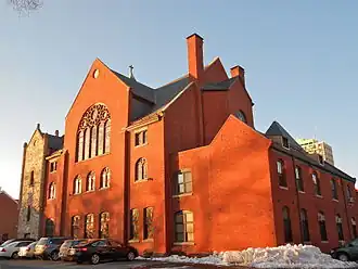 The present building, which was completed in 1890, is a three-story masonry structure with Romanesque styling. Its large round-arch windows are adorned with stained glass from Germany.[10]