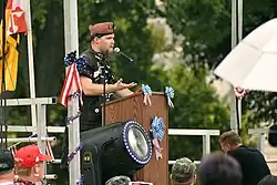 Speakers included Peter Boykin of Gays for Trump,[14][15] Patriot Prayer founder Joey Gibson, Tim Foley of the Arizona Border Recon militia group,[16] Marco Gutierrez of Latinos for Trump,[17] author Hamody Jasim,[18] and Omar Navarro.[8][19][20] They reportedly endorsed Trump's Presidential Memorandum for the Secretary of Defense and the Secretary of Homeland Security, which prohibits open military service of transgender individuals, and spoke out against sanctuary cities.[5] Crowd estimates ranged from several hundred to around 1,000 people.[21][22][23] The Associated Press reported there were 500 people assembled near the Washington Monument by 1:30pm, and one rally organizer taunted members of the media by inviting them to the stage to film but saying, "I know you don't like to show large pro-Trump crowds".[22] One speaker got attendees to chant "lock her up" in reference to Hillary Clinton, which was often heard at Trump events leading up to the 2016 U.S. presidential election.[7]