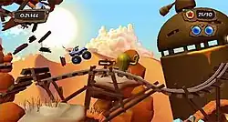 Three gameplay modes are included, Story, Online, and Party. Story mode is played by one player as they progress through the game's main campaign. Online play features new levels, challenges and online leaderboards. Up to four players can join in for simultaneous gameplay for Party mode.[3] Fourteen different vehicles are available, and includes over 100 levels. Bonus levels are often interchanged by the developer. Popular levels stay in play longer while those less popular are replaced by new or previous creations.[2] Each level is roughly 20 kilobytes in size, and approximately 50 were created to be interchanged post-launch. Each level remains online for 12–24 hours and features a score-based challenge system.[4]