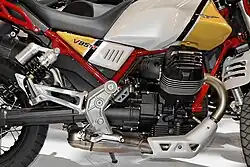 The engine is, typical for Moto Guzzi, an air-cooled longitudinal 90° V-twin Four-stroke engine. It features two valves per cylinder, which are controlled by one central camshaft via push rods and rocker arms. The intake valve is made of Titanium, which allows for a sharp camshaft profile due to its low weight. Fuel is injected electronically and the air intake is controlled by a central Throttle body, with a diameter of 52 mm. The throttle body is operated electronically (i.e. Ride by wire), allowing for different response settings. The engine generates 59 kW (80 PS) at 7750/min from its displacement of 853 cm3 and a compression ratio of 10,5:1. Maximum Torque is 80 Nm at 5000/min, while over 70 Nm are available between 3500/min and 8000/min.[3][4] The power is transmitted to the rear wheel via 6-gear transmission and a shaft drive. The Shaft drive is unique to the V 85 TT, which is the only middleweight adventure bike to feature it (as of April 2019). The motorcycle is homologated to the Euro-5 emission standard and has a fuel consumption of 4,9 L /100 km according to the WMTC cycle, which equals 118 g CO2 per kilometre.